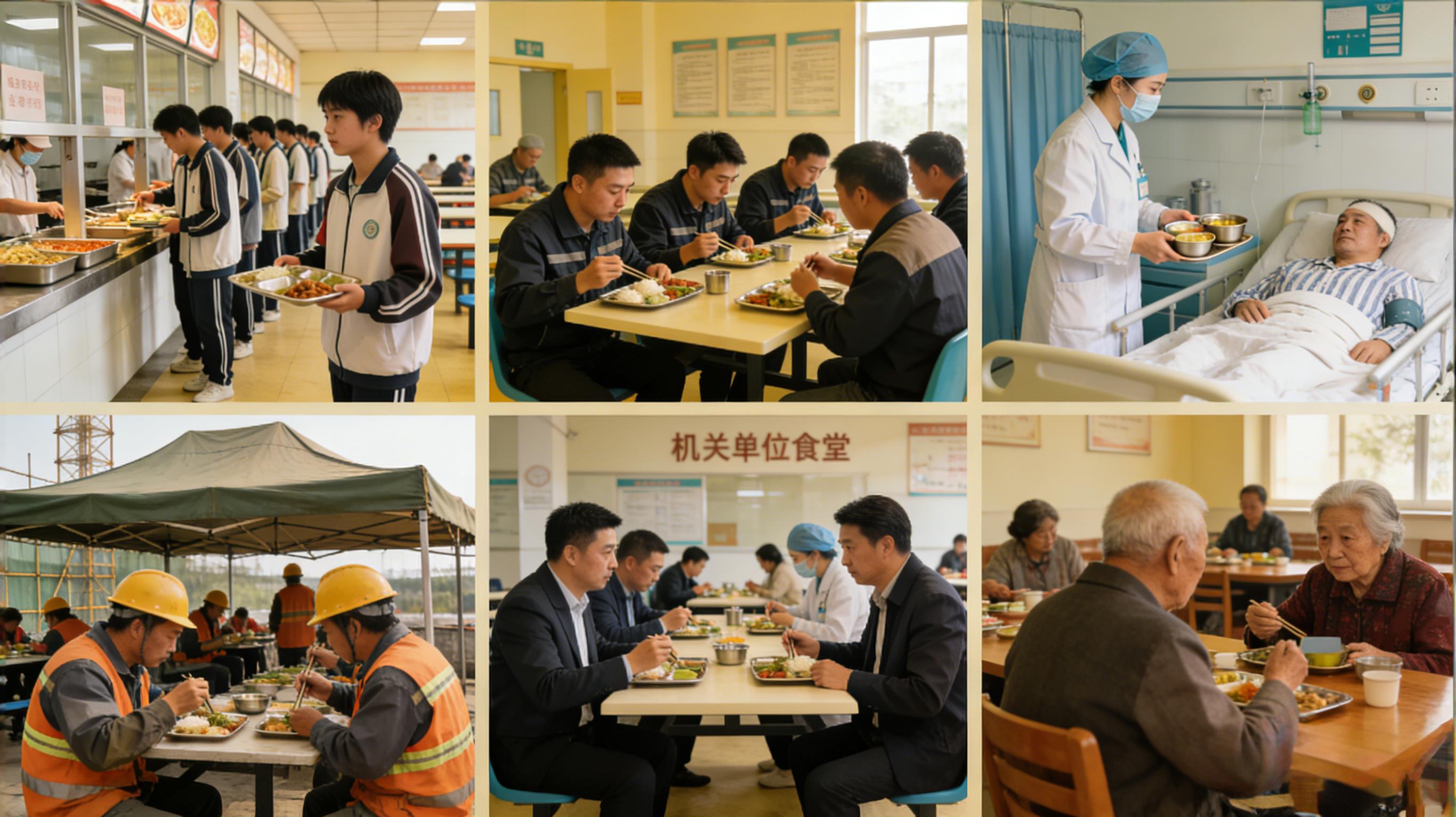 这种模式的应用范围广泛,涵盖学校(如义务教育营养改善计划供餐)、企事业单位员工餐、医院病患及医护餐、建筑工地工人餐、机关单位公务餐以及养老机构膳食服务等领域。