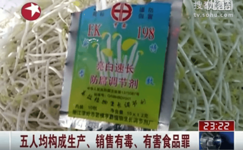 2011年,震惊全国的沈阳“毒豆芽”案终审判决。一对夫妇(蹇明志、杨桂荣)自2008年起,在黑加工店使用非食品添加剂生产豆芽,一天有1000公斤左右,全部销往当地菜场。最后,主犯被判了4年。