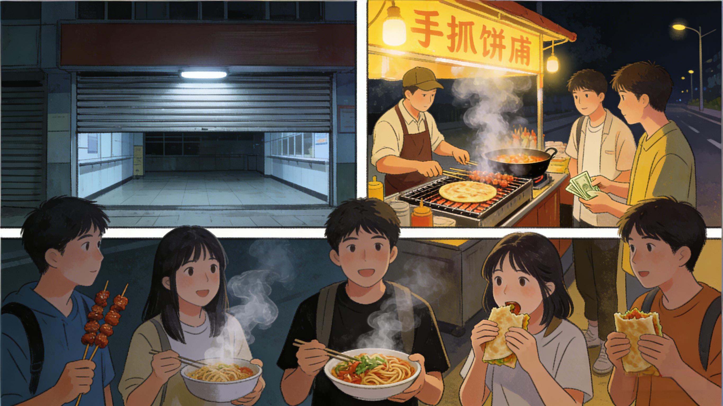 凌晨两点的烧烤、早八前的手抓饼、深夜的炒粉,这些才是大学生的真实作息。你的食堂晚上七点收档,人家凌晨两点还在数钱。