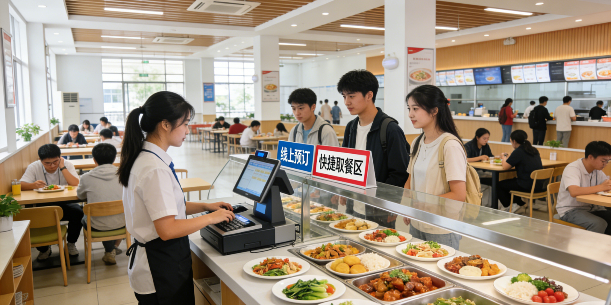 告别传统大锅饭的老旧思路,打造智慧食堂,上线线上预订、智能结算、快捷取餐服务,提升就餐效率;引入特色餐饮品牌,创新营养菜品,兼顾口味与颜值,贴合学生需求;改造食堂场景,打造就餐+自习+社交的复合型空间,让食堂不止是吃饭的地方。