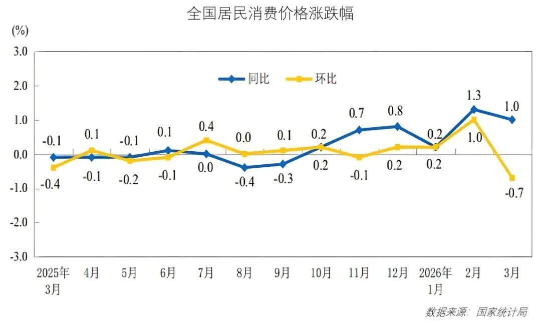 2026年3月,全国居民消费价格同比上涨1.0%,环比下降0.7%。其中,城市居民消费价格同比上涨1.1%,环比下降0.7%;农村居民消费价格同比上涨0.9%,环比下降0.5%;全国食品价格同比上涨0.3%,涨幅比上月回落1.4个百分点,环比由上月上涨1.9%转为下降2.7%。