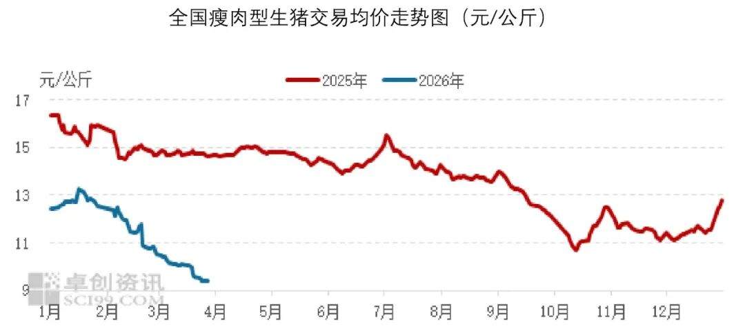 2026年3月,国内生猪价格下滑,月均价环比下跌。据卓创资讯监测,3月全国外三元交易均价为9.96元/公斤,环比下跌13.49%,同比跌幅32.46%。